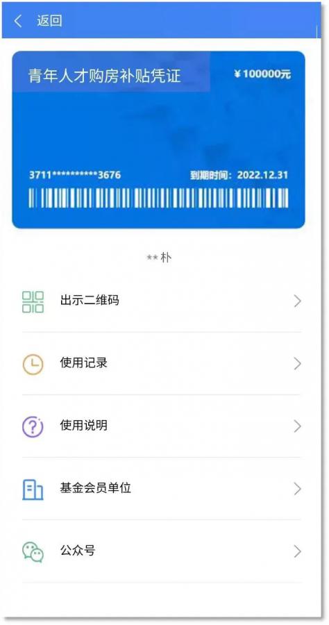6.憑證發放。公示完成后,青年人才自動獲取“青年人才購房補貼憑證”,并可在該頁面查看憑證基本信息、使用記錄、使用說明、基金會員單位等。