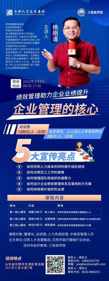 日照人才發展集團有限公司與日照市醫療器械行業協會、深圳市標桿教育、三奇商學院將于2022年3月8日共同組織舉辦《企業管理的核心》績效管理專題培訓。現已開班報名中,期待您的參與!